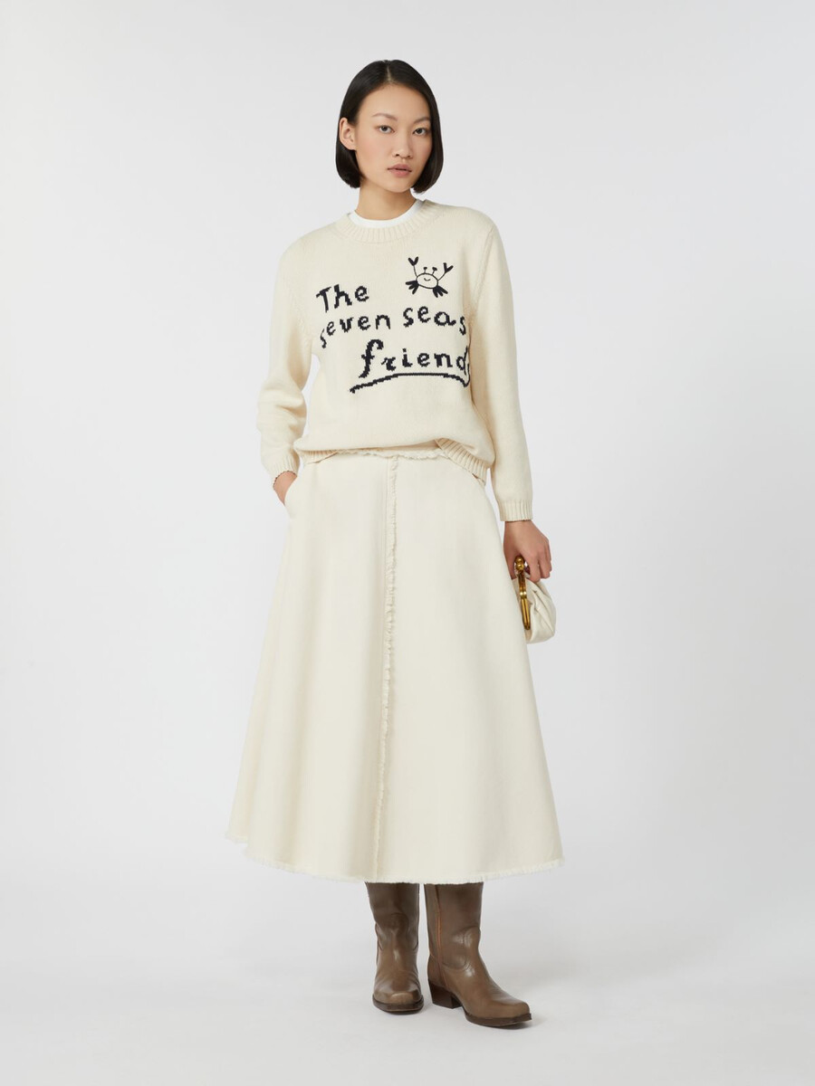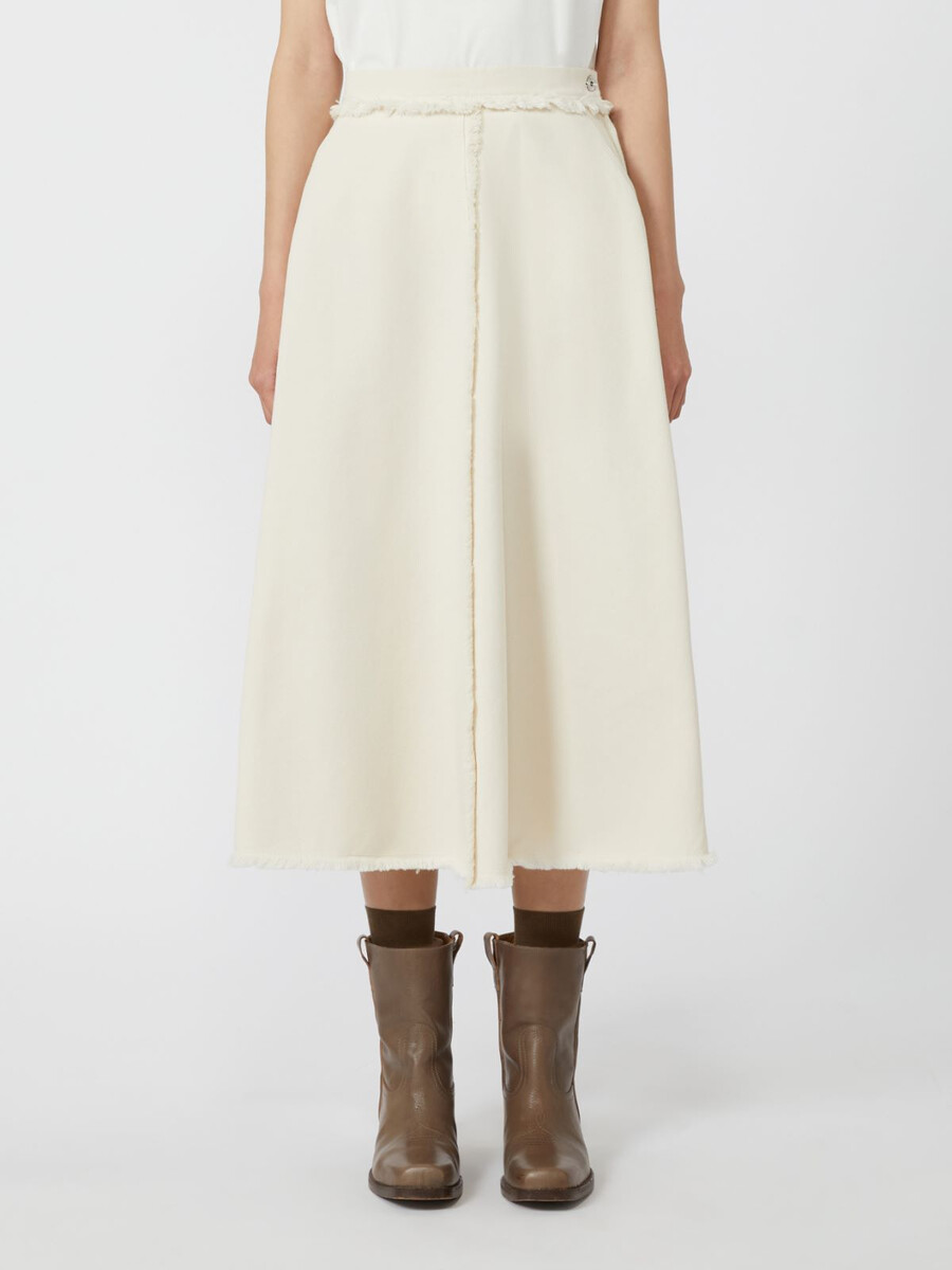 Wadenlanger Rock mit Fransen an Taille, Saum und in der Mitte.
