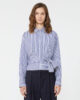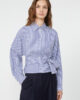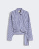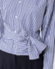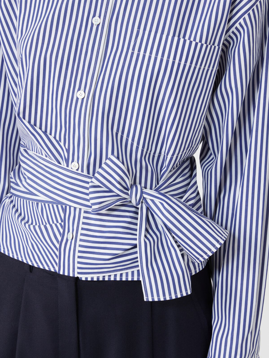 Feminine Bluse mit drapiertem Muster vorne und hohem Bindegürtel in der Taille.