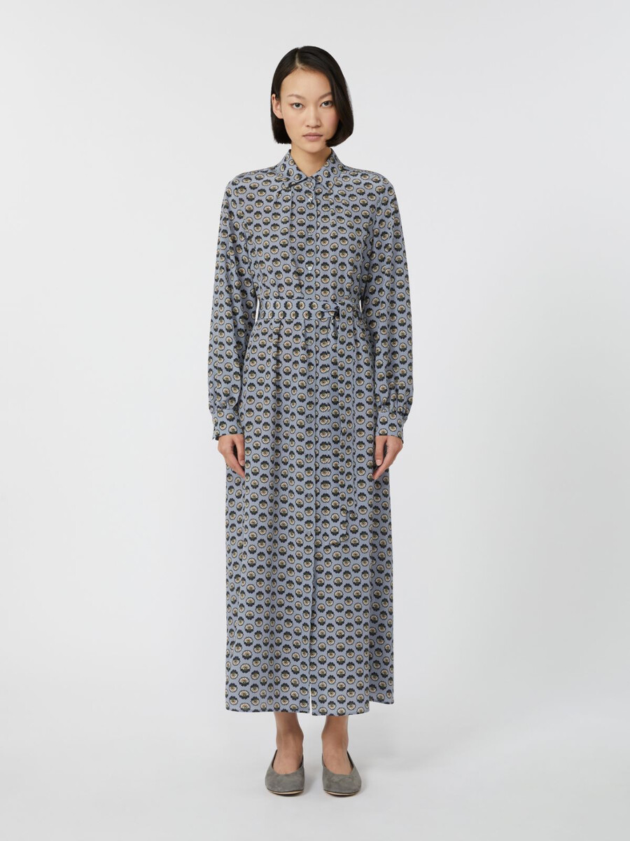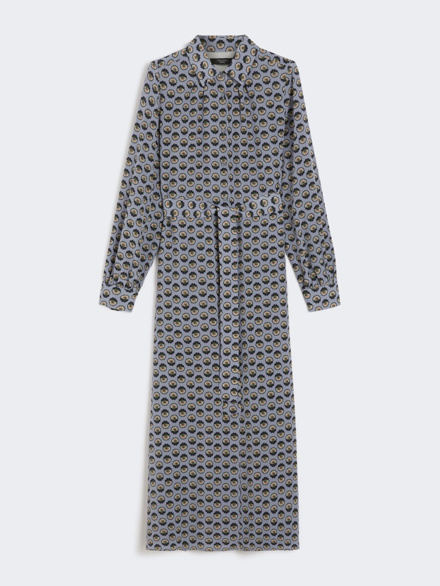 Langes Hemdkleid mit passendem Bindegürtel in der Taille. Bedrucktes Kleid aus reiner Seide (Crêpe de Chine)