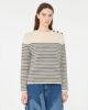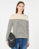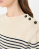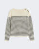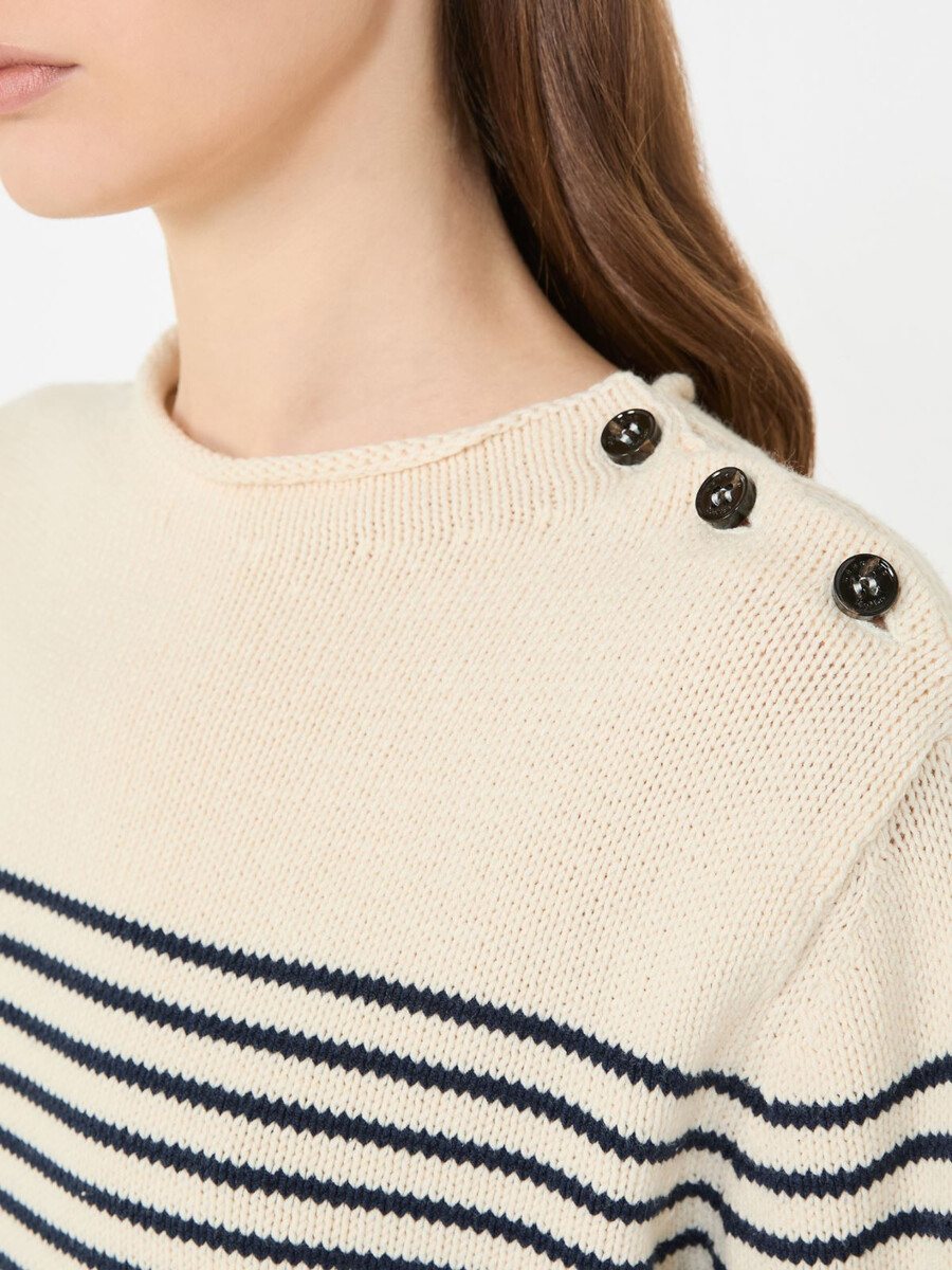 Rundhalspullover mit Knopfleiste an der linken Schulter.