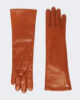 Maßgefertigte, halblange Handschuhe mit kleinem Metall-Schmetterlingslogo am Handgelenk.