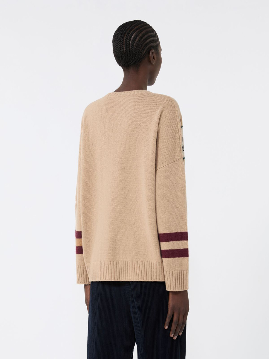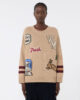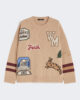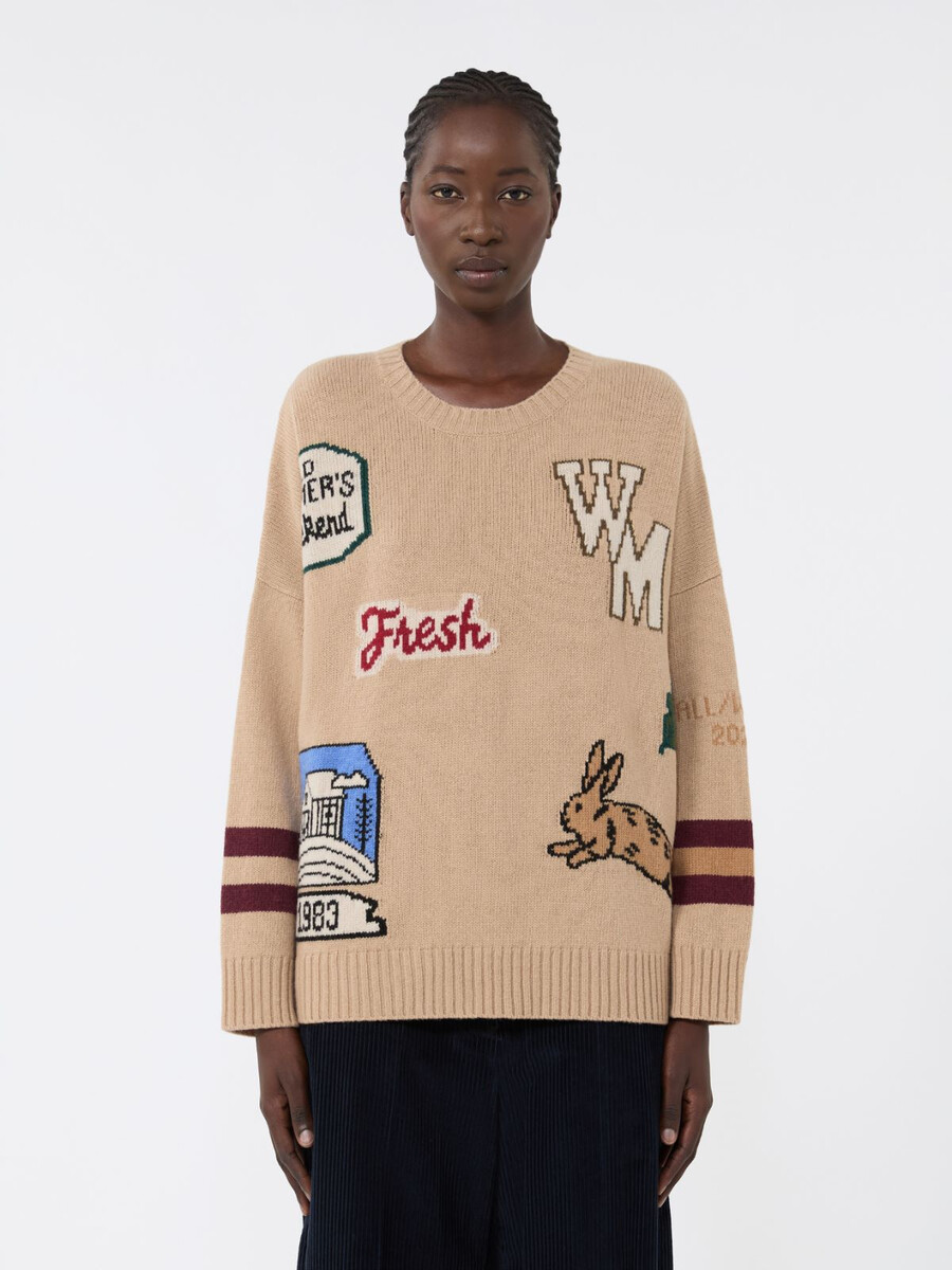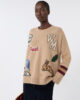 Übergroßer Pullover mit Intarsienmuster und Kollektionsmotiven auf Vorderseite und Ärmeln.