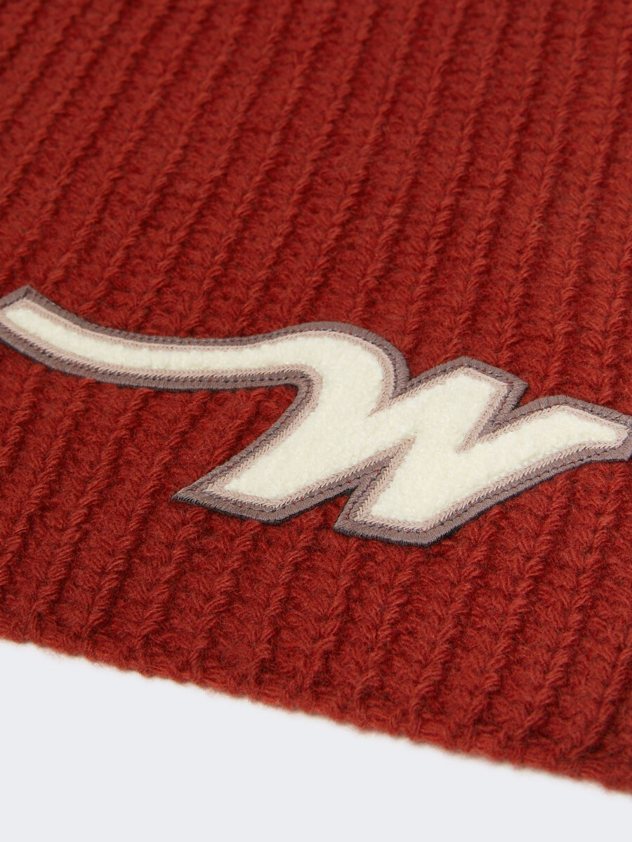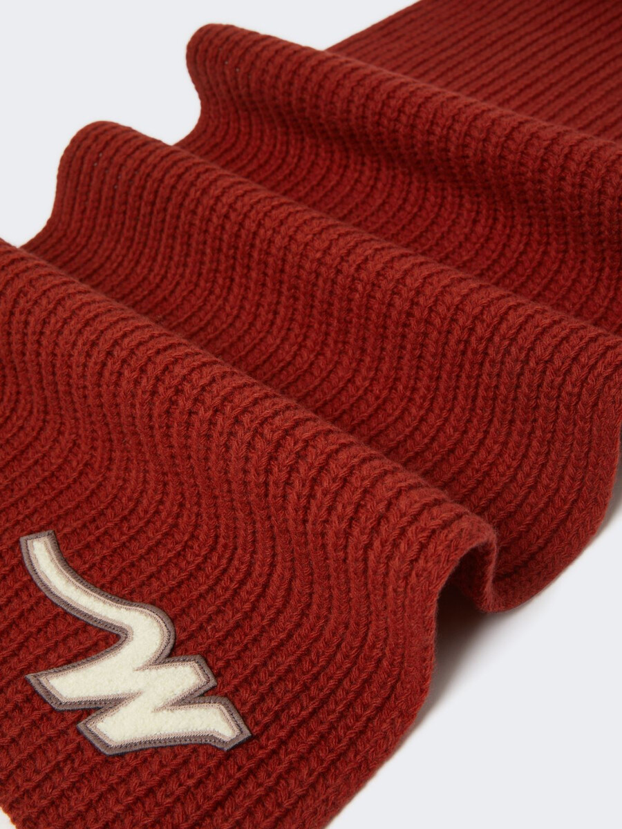 Langer Wickelschal mit einem individuell gestalteten „W“-Aufnäher am Saum.