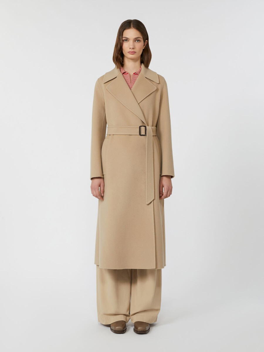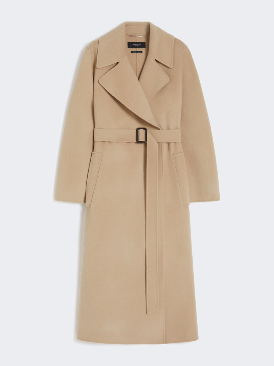 Langer Mantel mit passendem Taillengürtel.