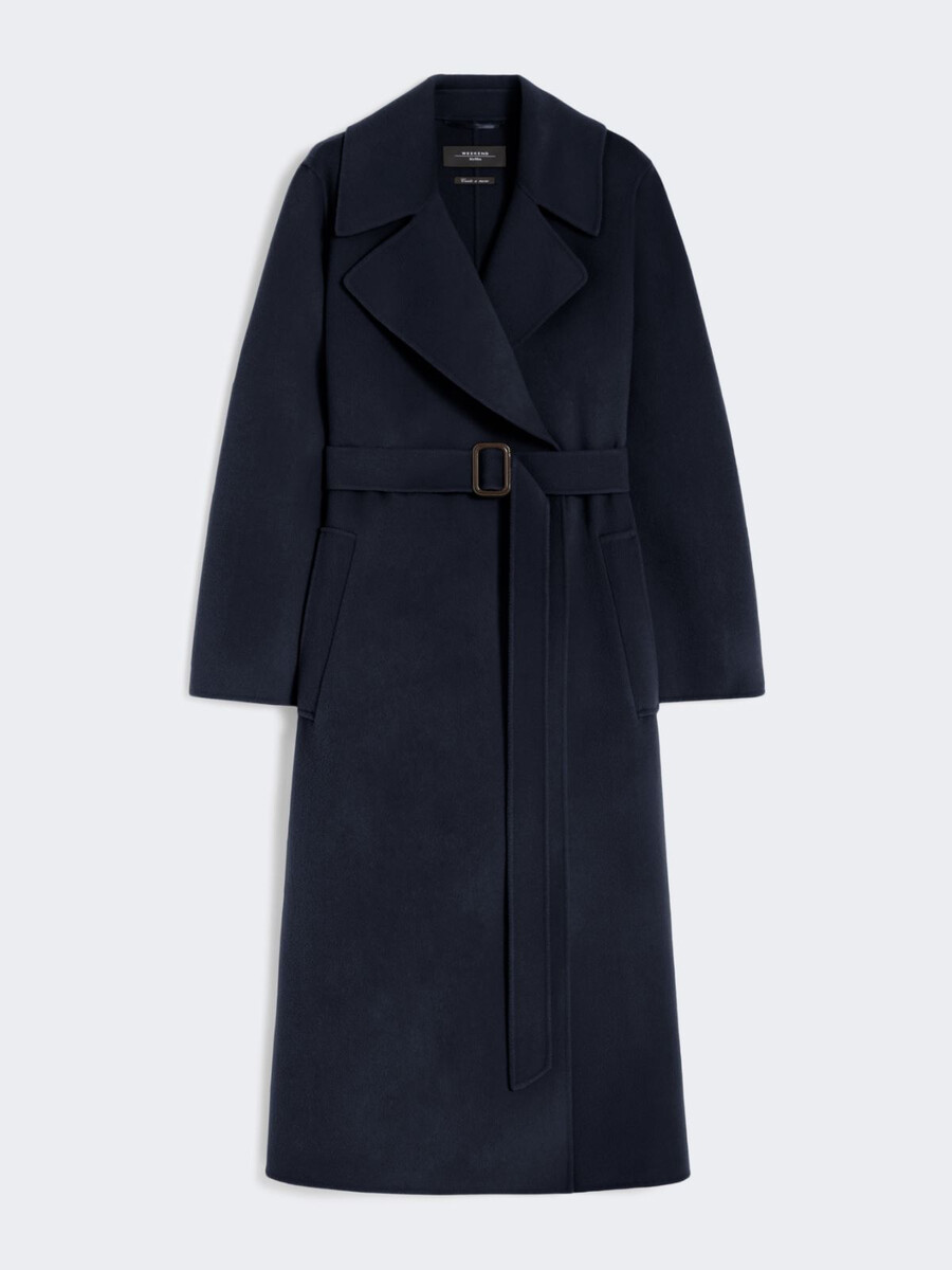 Langer Mantel mit passendem Taillengürtel.