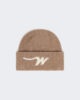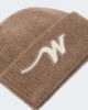Strickmütze, individuell gestaltet mit einem großen „W“-Aufnäher auf der Vorderseite.